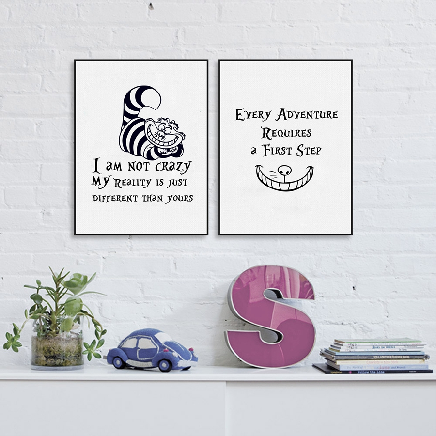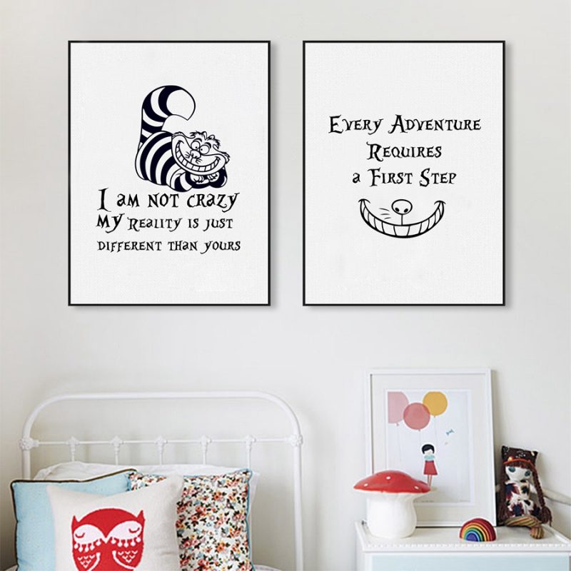 Introduce a sprinkle of whimsy and wonder into your little girl’s room with our Alice In Wonderland Canvas Wall Art. Featuring a classic quote from the Cheshire Cat, “I am not crazy,” this print is sure to ignite your child’s imagination and inspire her to be boldly herself. Our canvas poster art captures the enchanting essence of the beloved Alice in Wonderland tale, rendered in a modern minimalist style that seamlessly blends with a variety of room decor.
