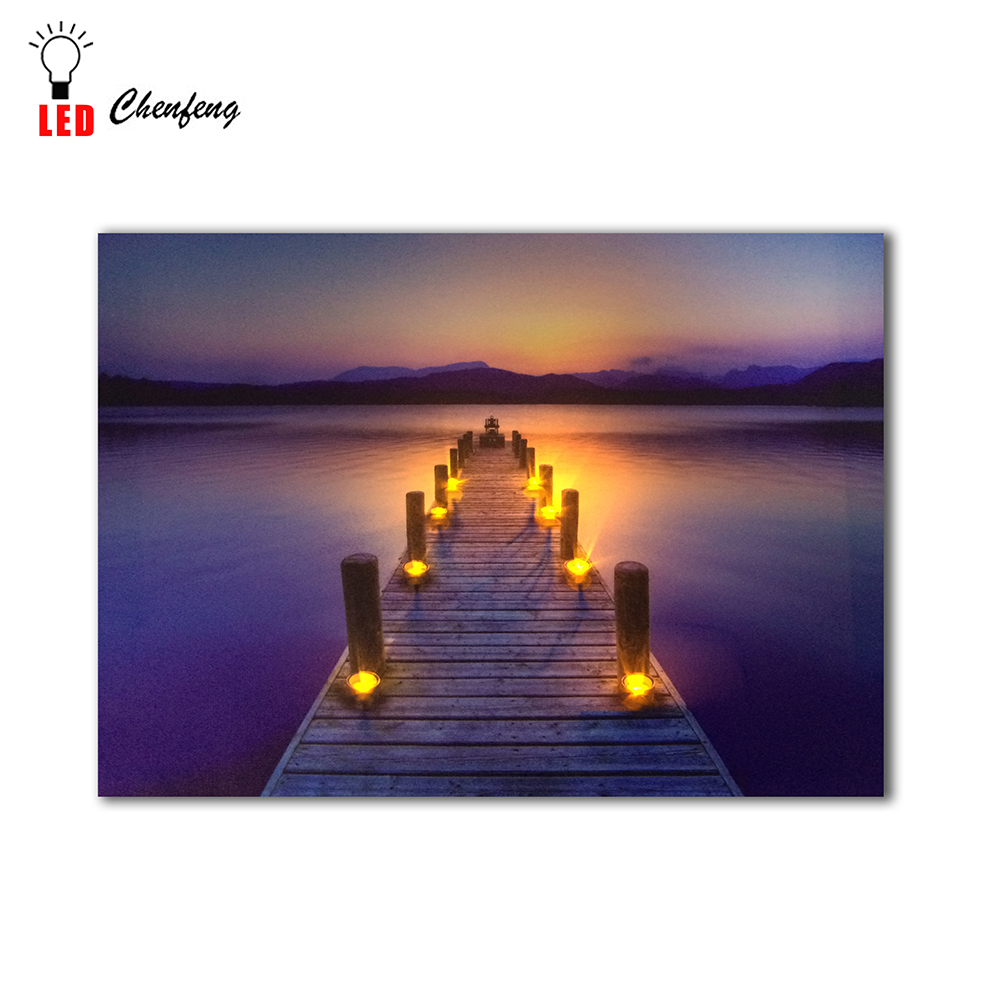 Led Illuminated Lake Beach Scene Canvas Wall Art With Flickering Candle Light For Home Decoration