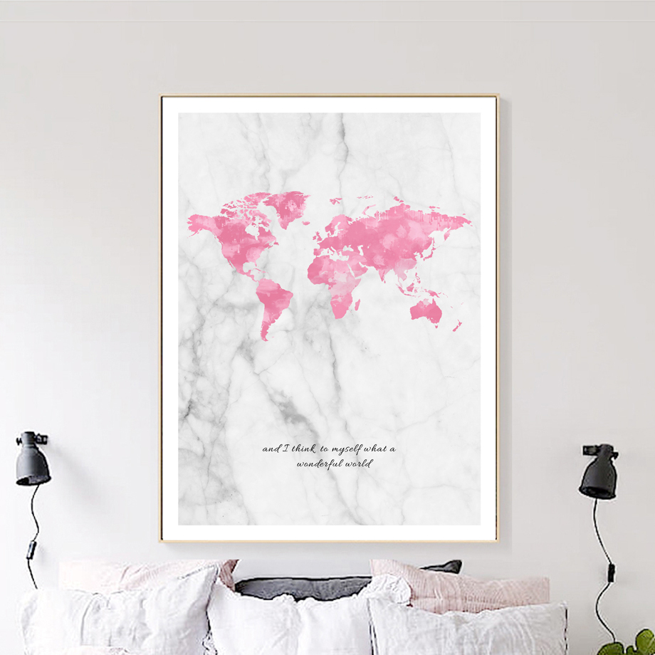 - This Nordic Style Pink Marble World Map Wall Art is an unframed canvas painting, ideal for enhancing your living room decor.
