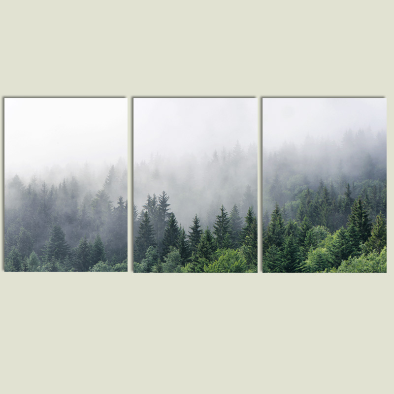 This three-picture combination showcases a landscape, tree, and green plants, carefully arranged to create a cohesive and compelling design. The inclusion of a foggy forest and vibrant green plants brings a calming, naturalistic charm to any room.