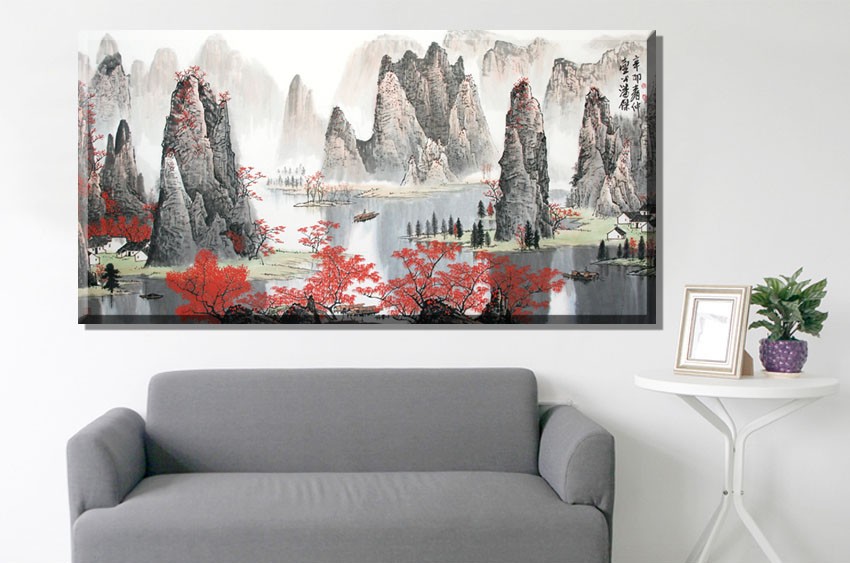 - Immerse yourself in the serene beauty of the East with our Vintage Chinese Landscape Red Maple Boat Canvas Wall Art Print Decor, a perfect addition to your home or office decor.